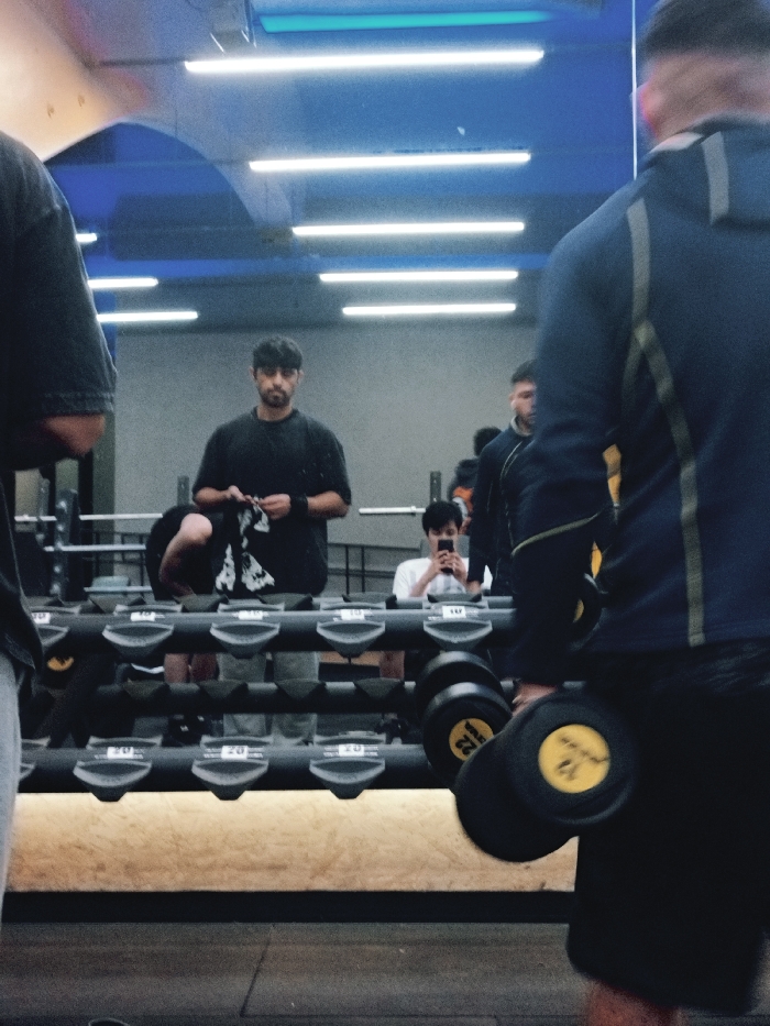 A mirrored gym scene shows several individuals. A man in a black t-shirt stands holding a cloth. Another person wearing a white shirt is using a phone, seemingly taking a photo. Weight racks are visible, and a person in athletic wear is holding dumbbells in the foreground. Fluorescent lights illuminate the space, creating a mirrored effect.