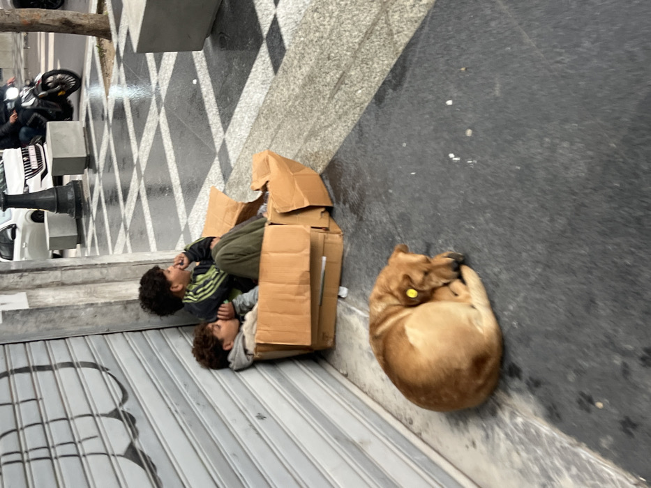 The image captures an outdoor urban scene in Tanger, Morocco, on a wet day. Two young males are seated against a closed grey metallic storefront shutter. The individual on the left, with light brown curly hair, wears a grey hooded sweatshirt and rests his left hand near his mouth. The individual on the right, with dark curly hair, wears a dark jacket with green stripes and olive-green pants, resting his right hand near his mouth. Both are positioned within several flattened brown cardboard boxes that serve as makeshift seating or shelter. In the foreground, a medium-sized, light brown dog with a yellow ear tag is curled up asleep on the dark grey pavement. The pavement is wet and features a pattern of dark and light grey tiles. In the background, a street is visible with a white car, a person on a black motorcycle, a dark ornate street lamp, and grey concrete barrier blocks. The lighting is overcast.