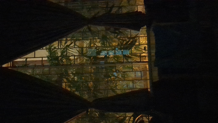 The image presents a nighttime scene viewed from an interior space through a window located in Hà Nội, Vietnam. The window is framed on both sides by dark, heavy curtains drawn inward, revealing the exterior. A dark-colored metal security grill, featuring a grid pattern, is installed externally across the window. Beyond this grill, dense green foliage, consistent with trees or large shrubs, is visible and distinctly illuminated by an artificial light source, casting a warm, yellowish glow from below or behind the vegetation. A prominent, vertical, bluish light reflection appears on the window glass, positioned slightly right of the frame's center. The lower section of the image shows a dark, indistinct windowsill or supporting surface. No individuals are depicted, and no specific actions or interactions are occurring. The environment suggests an urban or suburban setting.