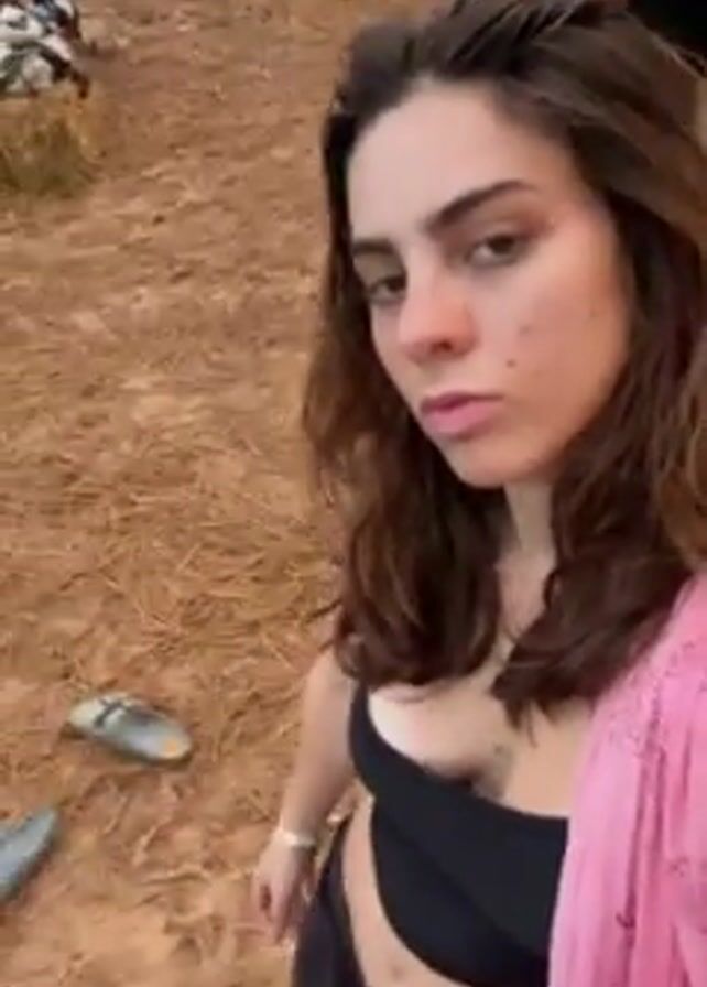 A woman is standing outdoors. She is wearing a black tank top and a pink shawl. She has brown hair and a tattoo on her arm. The camera is held up close to her face. In the background there are other people, lights, and structures. She then lies back in a pink hammock strung between wooden poles. The camera pivots, revealing a lush green landscape beyond the edge of the cliff where the hammock is strung. Another person is briefly visible at the edge of the frame, wearing a blue top.