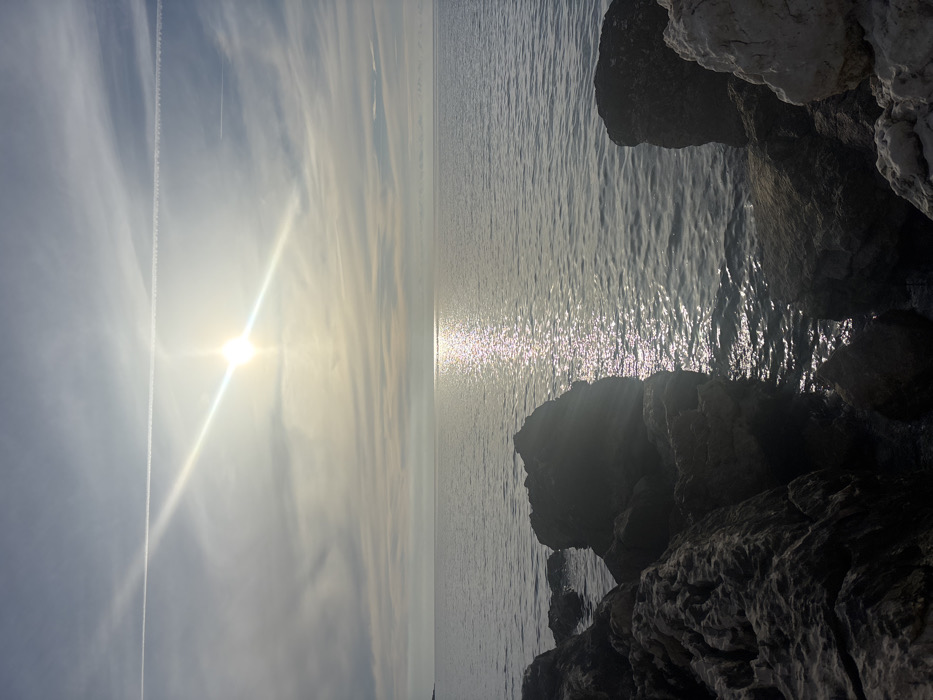The image displays a coastal scene in Kruče - Kërruçi, Montenegro, under a partly cloudy sky. The sun, appearing as a bright, starburst light source, is positioned slightly above the center of the frame, casting a shimmering, vertical path of light across the calm, dark grey-blue sea. An elongated airplane contrail traverses the upper sky horizontally. The foreground consists of a rocky shoreline, with dark, irregular rock formations occupying the left side and bottom center, some partially submerged in the water. Lighter-colored, weathered rocks are visible along the bottom right edge. No individuals, vessels, or additional man-made structures are present within the frame.