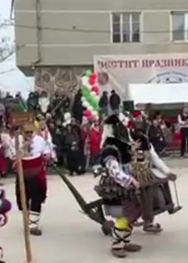 Here’s a description of the video: The video shows a festive gathering in what appears to be a town square in Bulgaria. The atmosphere seems lively and celebratory, with many people dressed in traditional Bulgarian clothing and costumes. There are dancers performing, some carrying or manipulating a wooden farming tool that resembles a plow. A man in religious attire, a priest perhaps, is also part of the group, blessing the event with green branches. A crowd of onlookers, including children and adults, is gathered to watch the performance, with some holding Bulgarian flags and colorful balloons. In the background, there's a building with a banner that reads "ЧЕСТИТ ПРАЗНИК АЙДЕМИР!" (Happy Holiday Aidemir!). There's also a tent set up, and the overall setting suggests a public celebration or festival.