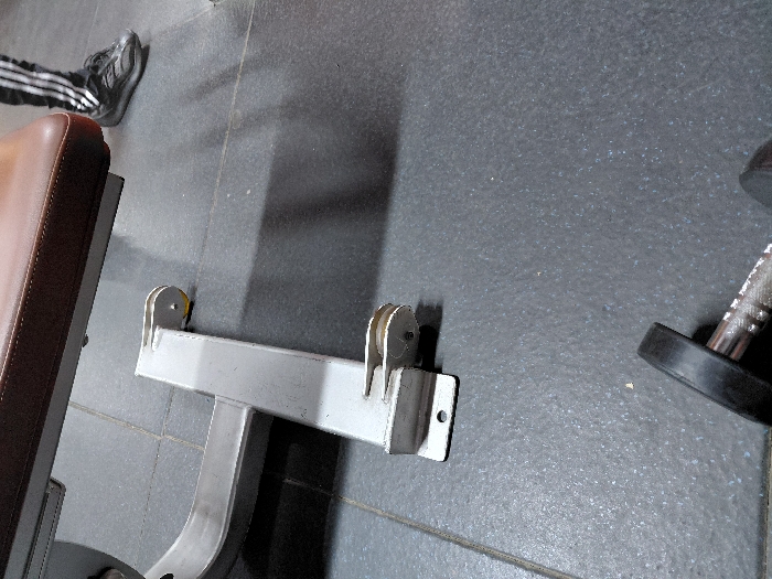The image depicts a section of a gym located in Mohammedia, Morocco. A brown padded weight bench is positioned in the upper left quadrant, supported by a silver-colored metal frame with visible attachment points. To the upper right, a person's lower leg and foot are present, clad in black track pants with white stripes and dark athletic shoes. A shadow extends from the left side across the dark gray tiled floor. In the lower right corner, the black end of a dumbbell with a silver knurled handle is partially visible on the floor. No direct action or interaction is discernible.