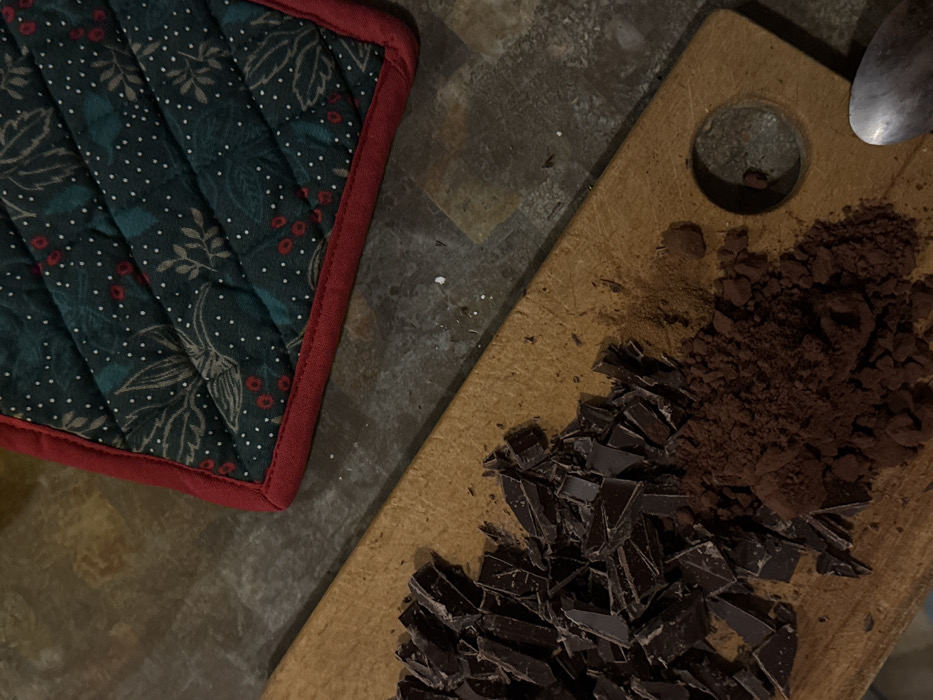 A green quilted potholder with a red border sits next to a wooden cutting board. The board holds a pile of chopped dark chocolate and a mound of cocoa powder. A spoon rests at the board's top right. The arrangement is set against a mottled gray and brown surface.