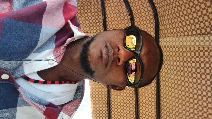 A man lies against a checkered backdrop, sporting sunglasses that reflect a yellow hue. He wears a partially unbuttoned plaid shirt over a white t-shirt, adorned with a red and black necklace. An earpiece wire snakes toward his face. His eyes are closed, and his expression appears relaxed.
