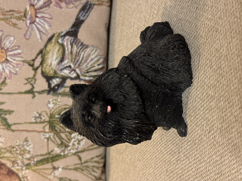 An indoor photograph displays a black statuette of a dog, resembling a Pomeranian, seated on a light beige, tightly woven fabric surface
