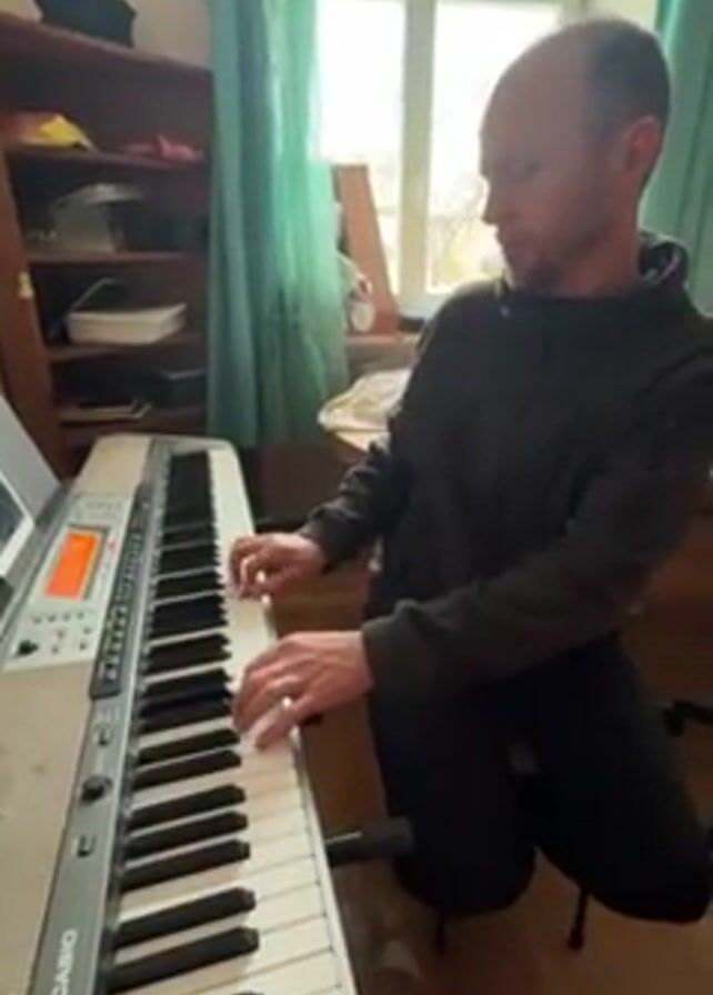 A man sits at a Casio keyboard, playing with both hands. He stops, looks at the camera, and rests his hands on his lap. The keyboard is off-white with gray accents. He sits on a stool and wears a dark gray long-sleeved shirt and black pants. Behind him is a window with green curtains. To the left of the keyboard is a wooden bookcase with various items on its shelves. The floor is light-colored wood.
