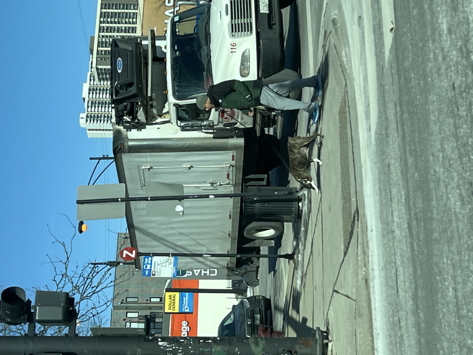 A man stands by a white truck on a city street next to a dog. The truck bears the number "116". Various signs are visible, including one with "CHAGE" and another for "DOLLAR GENERAL". A street light and traffic signal are also present in the foreground. Tall buildings rise in the background.