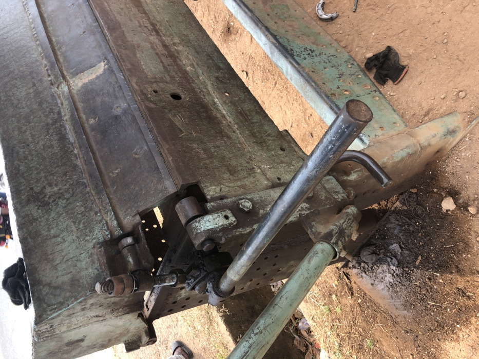 The image depicts a heavily used and weathered sheet metal bending machine, located outdoors in what appears to be a workshop or fabrication area within the city of Oshogbo, Nigeria