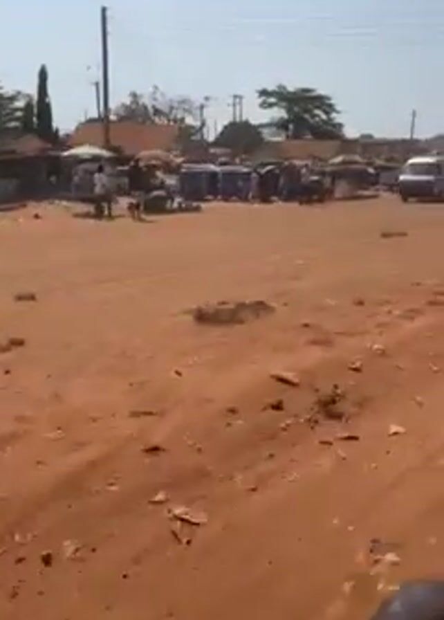 scene from a moving vehicle on a dirt road leading towards a small town center on a bright, sunny day. The ground is red dirt. There are various vehicles, including motorcycles, tuk-tuks, and a white van, scattered around. People are walking and standing in the town center, which appears to have market stalls. A person in black and white striped pants stands near the edge of the road. Power lines are visible in the sky. The sound of wind can be heard.