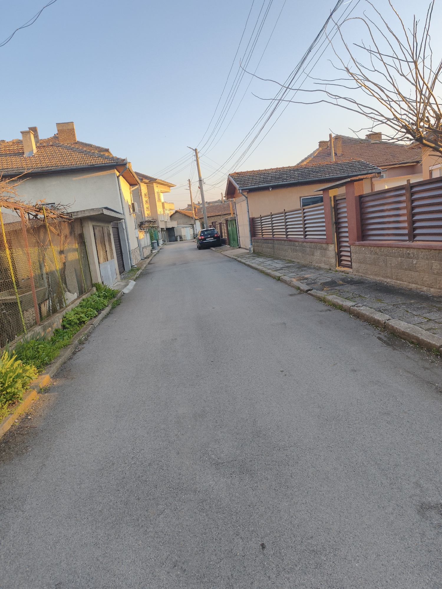 A straight asphalt road stretches into the distance in Pavlikeni, Bulgaria. The road is flanked by houses with terracotta tiled roofs and fences, one of which is a modern horizontal slat fence with brick columns. Power lines crisscross overhead. A black car is parked further down the street. Greenery is visible alongside the fences. The sky is clear and blue.