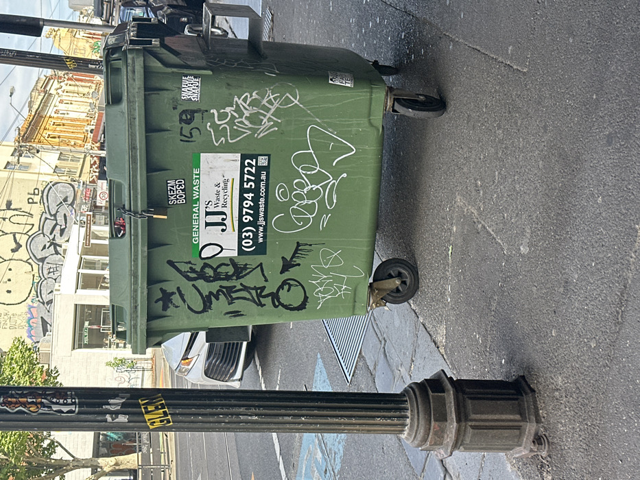- "The image depicts an urban street scene in Fitzroy, Australia, focusing on a large green commercial waste bin and an ornate lamppost in the foreground" by FM-P0ePn2, licensed under CC BY 4.0