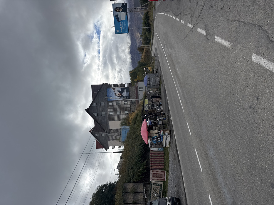 This image depicts a roadside scene in Gudauri, Georgia, under an overcast sky with patches of brighter cloud visible towards the mountainous horizon on the right