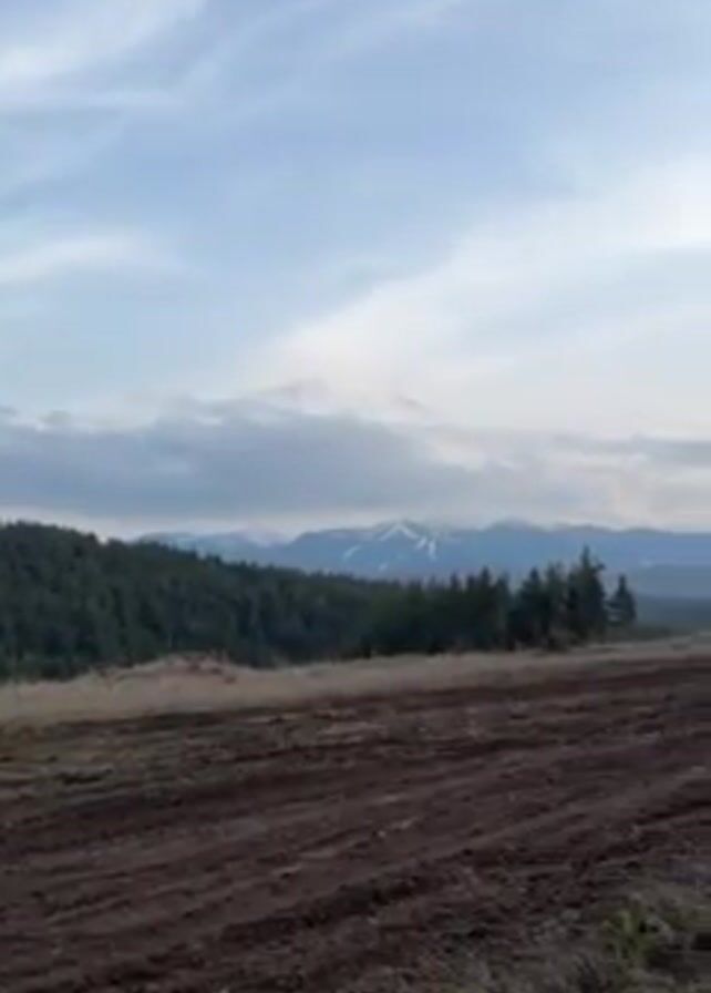 The video depicts a wide-angle shot of a landscape under a cloudy sky. In the foreground, there's a plowed field with visible rows of dark soil. Adjacent to the field is a dirt road. A line of trees separates the field from a distant mountain range, some peaks of which are covered in snow. The sky is mostly light blue with streaks of white and gray clouds. The scene appears calm and natural.