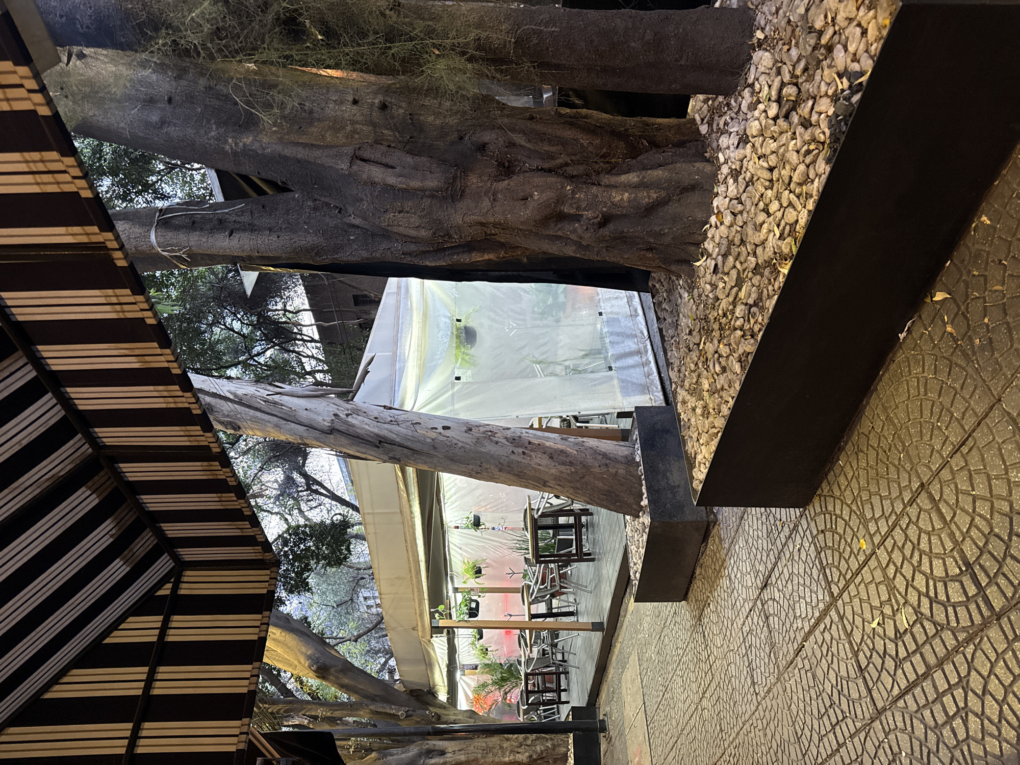n outdoor cafe or restaurant setting in Mexico City, Mexico. The image appears to be taken at night. The cafe has a striped awning to the left side of the image. The flooring is patterned concrete tiles. To the right is a border of light-colored pebbles. The cafe tables and chairs are visible through a white, semi-transparent partition. Trees are integrated into the cafe's design, with trunks passing through the structure. The overall lighting suggests an ambient, potentially upscale atmosphere.