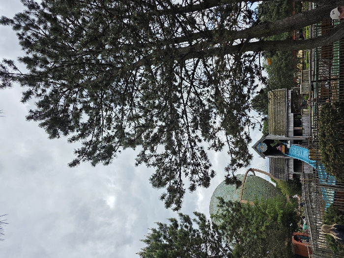 wooden structure with a blue water slide in front of it. The structure has a wooden roof and is partially covered by trees. In the background, there is a large, green, spherical structure. In the foreground, there is a wooden fence and a person standing near it. The scene appears to be in a park. The image was captured at the coordinates 52.621 latitude, 6.564 longitude, which is the location of the Slagharen amusement park in the Netherlands. The photo is taken from a low angle, with the camera pointing slightly upwards towards the top of the structure. The sky is cloudy and the weather appears to be overcast. The trees are dense and provide shade over the area. The scene is quiet, with only the person in the foreground visible. The people in the distance are obscured by trees and other structures. The image appears to be taken on a cloudy day. The tone of the image is subdued, reflecting the overcast weather. The overall impression is one of quiet contemplation and the anticipation of adventure.