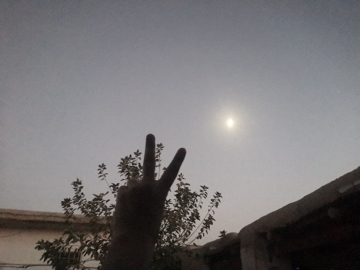 The image depicts an outdoor scene in Akhundzadakhail, Pakistan. The sky is a uniform grey, with a bright, circular celestial body, identified as the moon, prominent in the upper right quadrant. In the foreground, a human hand, silhouetted against the sky, is positioned centrally, forming a 'V' gesture with the index and middle fingers extended. Behind the hand and to its left, a leafy tree or bush is visible, also silhouetted. Architectural structures are present in the lower background: a light-colored building with a flat roofline is partially visible on the left, and a darker, textured building element, possibly a roof or overhang, occupies the lower right. No other individuals or interactions are visible.