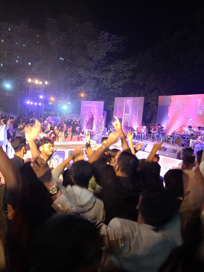 A crowd of people is gathered at night for an outdoor music event. A stage with performers and instruments is illuminated by bright lights. Large banners adorn the stage with text including "FOLK FEST 2025" and "MUSIC FOR SOUL". Many in the audience have their hands raised in the air, seemingly enjoying the music. A building and a large tree are visible in the background.