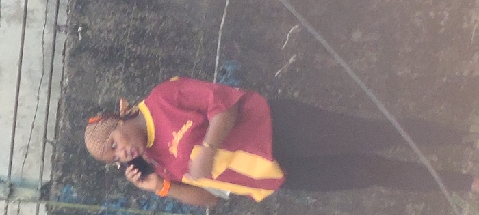 A woman wearing a red and gold top is engrossed in a phone conversation. She has a netted head covering and an orange bracelet on her wrist. The background features a gray wall with what looks like metal bars. Additionally, there's a dark, unidentifiable shadow and a white cable extending across the upper right corner. The photo seems to be taken from a slightly elevated angle, emphasizing the woman and her activity.