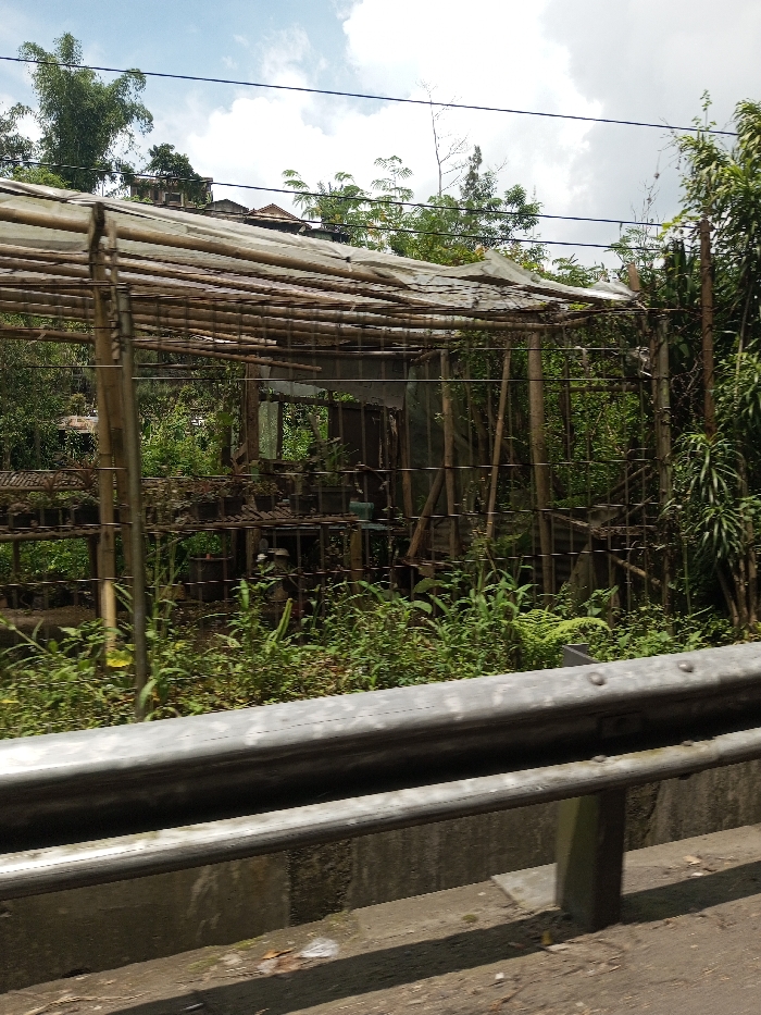 The scene depicts an outdoor environment in Vieng Phouka, Laos, observed from a roadside vantage point under a partially cloudy sky. In the foreground, a gray metal guardrail with visible rivets extends horizontally across the lower third of the image, resting upon a concrete barrier. An asphalt surface is discernible below the barrier. Immediately behind the guardrail, dense green vegetation, including various leafy plants and ferns, occupies the ground. The midground features a rustic, rectangular structure, likely a plant nursery or greenhouse. This structure is primarily constructed from bamboo poles forming a skeletal frame, with a partial roof cover made of a light-colored, weathered tarp and additional horizontal bamboo slats. The sides appear to be enclosed by a dark-colored mesh or netting. Within the structure, multiple dark-colored plant pots are arranged on tiered wooden or bamboo shelving units. Beyond the structure, the background is dominated by a lush expanse of green trees and foliage. In the upper left background, portions of roofs and upper sections of buildings are visible amidst the distant trees. Multiple thin, dark power lines traverse the sky horizontally above the scene. No individuals or discernible actions are present.