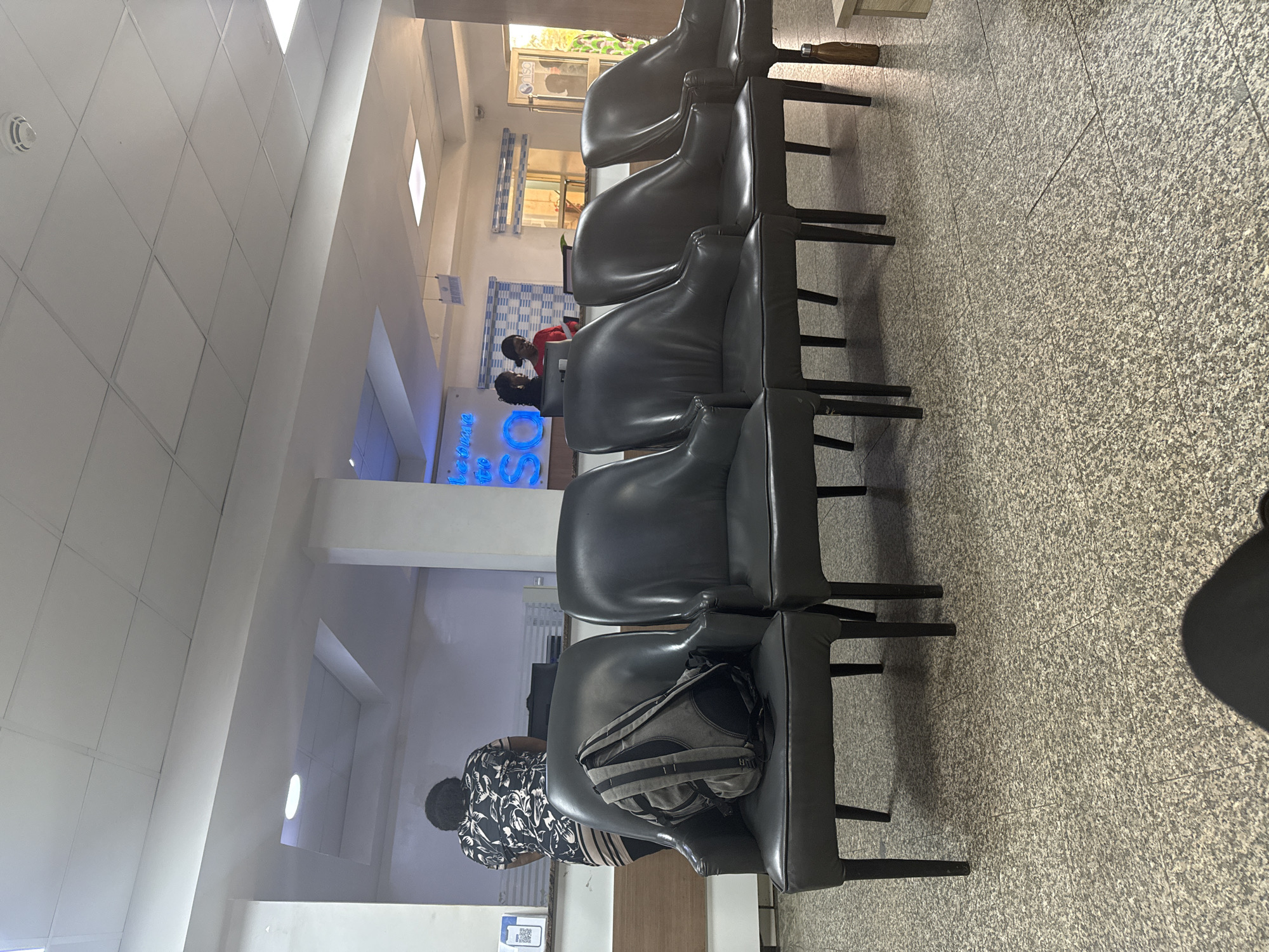 This image captures the interior waiting area or reception of an establishment in Gwarinpa, Nigeria. The foreground features a light grey speckled tiled floor. Six black, armless, upholstered chairs with dark legs are arranged in a row, facing a reception counter. A grey backpack with black straps rests on the leftmost chair. A brown water bottle stands on the floor next to the rightmost chair. Behind the chairs, a light wooden counter with a dark base serves as a reception desk. A person, viewed from the back, wearing a black and white patterned top and a striped skirt, stands at the left side of this counter. A white sign displaying a QR code is visible on the counter's left. Behind the counter, two female staff members are positioned. One, wearing a dark top, is partially obscured by a computer monitor. The second, wearing a red top, is observed looking downwards. The background consists of white walls and a white drop-panel ceiling. Various recessed and strip lighting fixtures are integrated into the ceiling, alongside a visible smoke detector. A blue neon sign, partially reading "Welcome to SO," is mounted on the wall behind the staff. To its right, a window is fitted with blue and white patterned blinds. A hanging sign, partially legible as "REGISTRATION," is suspended from the ceiling. A glass door with a "nisa" logo is visible on the far right, showing blurred figures and natural light beyond.