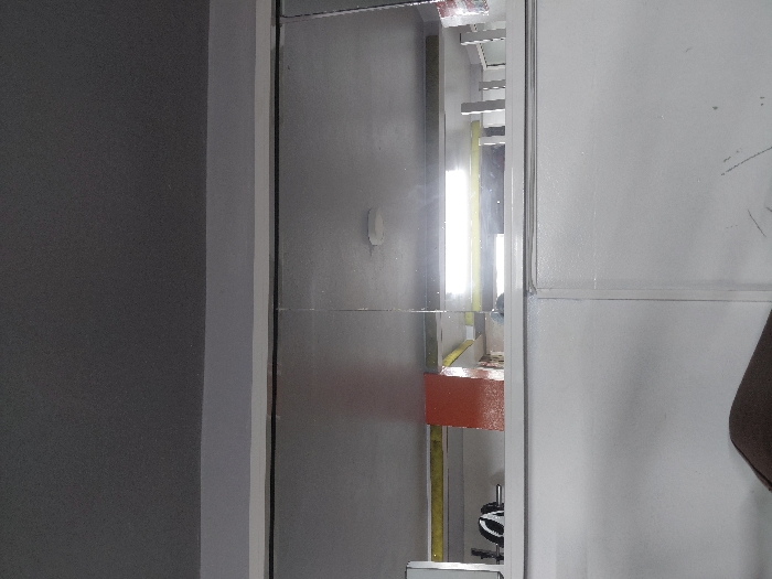 A bathroom mirror reflects a brightly lit, modern interior. An orange sink with yellow piping is visible in the reflection. To the left of the mirror is a gray wall. The mirror is surrounded by a white frame, and to the right is a white wall with smudges and a brown cloth.