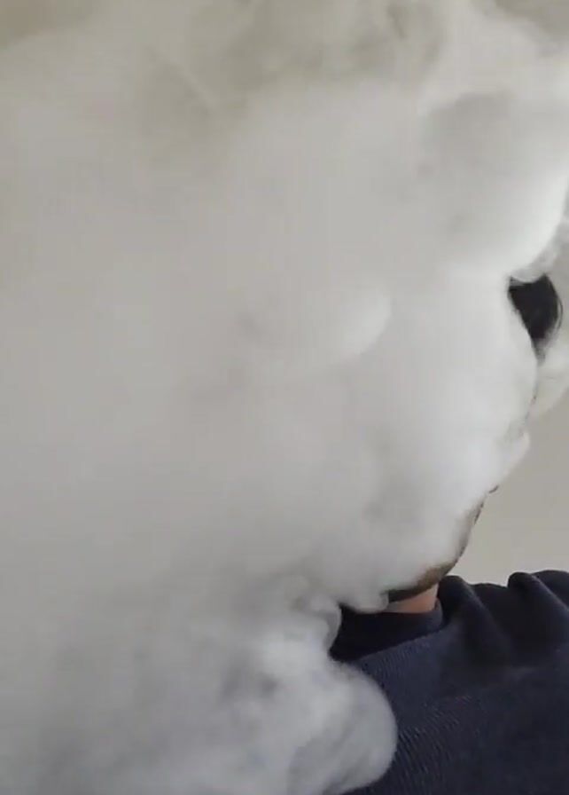 A person exhales a large plume of white vapor. The vapor surrounds their head and obscures most of their face. The person is wearing a dark blue sweater. The background is a white ceiling with a circular light fixture.