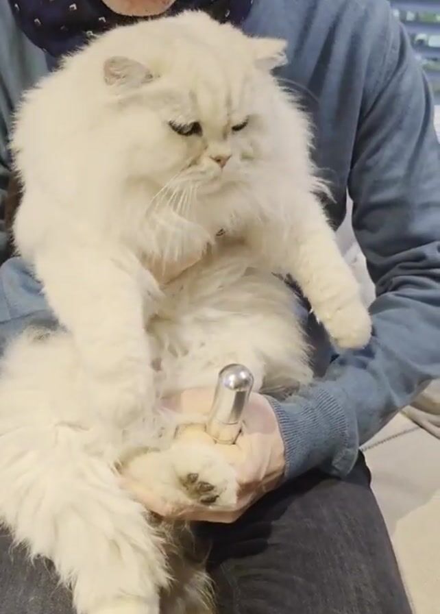 A man is sitting down, holding a fluffy white cat on his lap. He is wearing a blue sweater, dark pants, and a scarf with a navy blue and white pattern visible at his neck. In his right hand, he holds a small, silver cylindrical object, which he appears to be using near the cat's front paw. The cat has long, white fur and is looking at the camera with a serious expression. The background is slightly out of focus but appears to be an indoor setting. The camera remains relatively still throughout the short clip.