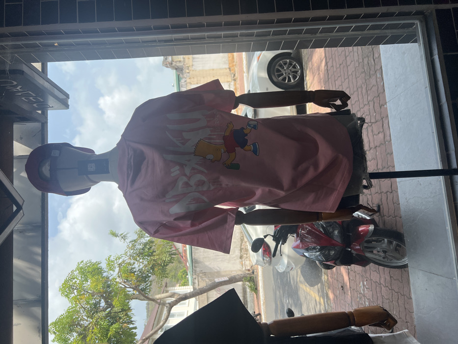pink T-shirt with a cartoon character and the word "DBAKU" printed on it, displayed in a shop window