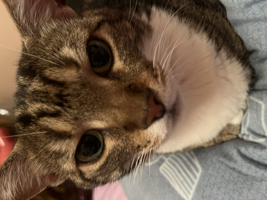 - "A close-up shot depicts a brown and white tabby cat lying on a blue and white patterned surface" by FM-aeu8u2, licensed under CC BY 4.0