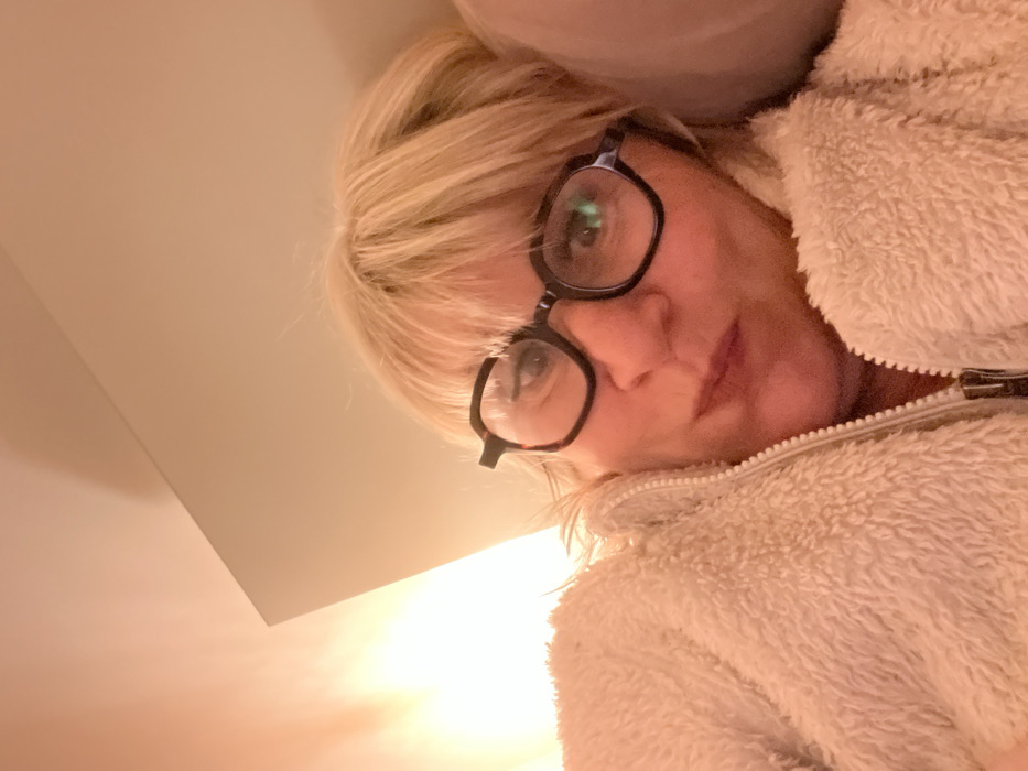 A woman with blonde hair and glasses looks down at the camera. She wears a light-colored, fuzzy zip-up jacket. The lighting is warm and diffused, with a bright light source positioned below the woman. A pale ceiling is visible above. The woman's face is the focal point, with her eyes and lips clearly visible. The angle is slightly skewed.