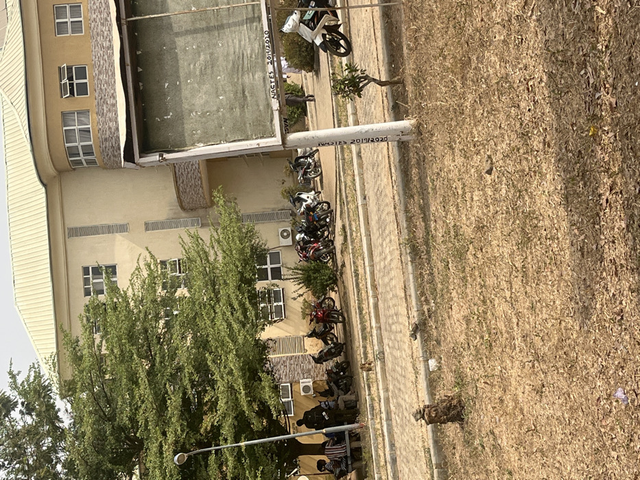 The image displays an outdoor scene in Nassarawa, Nigeria, characterized by a multi-story, cream-colored building with a light-toned sloped roof and multiple white-framed windows, some partially open