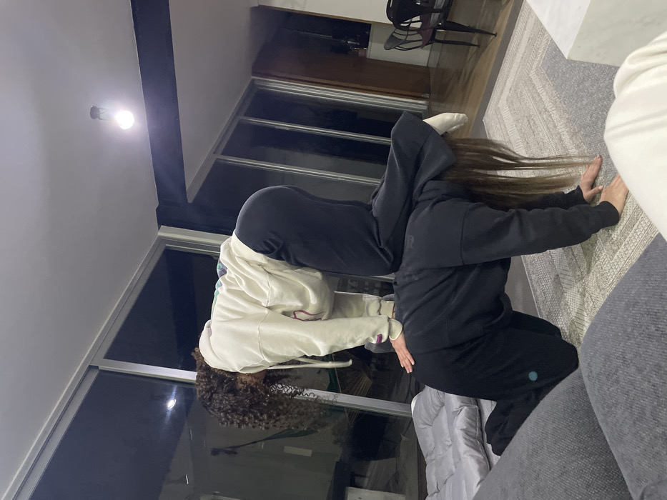 Two individuals are stacked head-to-toe inside a modern home