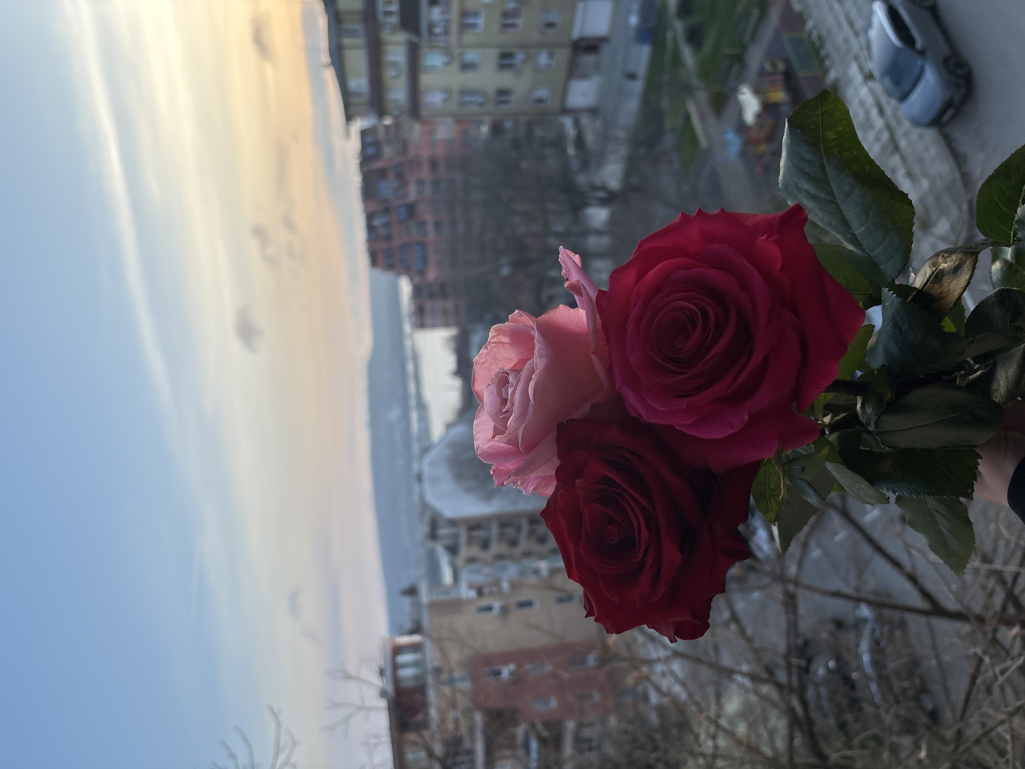 The image displays a human hand holding a bouquet of three roses—one light pink and two dark red—in the foreground. The background reveals an urban landscape in Varna, Bulgaria, observed from an elevated position, likely a balcony or window. The scene features multiple multi-story residential buildings, including a prominent light brown/beige structure on the right and a red-orange building with a distinctive angular roofline in the middle distance. Bare deciduous trees are visible between the structures. In the lower right, a silver-grey SUV, likely a Dacia Duster, is parked on a visible street, adjacent to a children's playground with colorful equipment. The distant background shows a large body of water, identified as Varna Bay, stretching across the horizon, bordered by indistinct landforms or hills. The sky exhibits a gradient of light blue transitioning to soft orange and yellow hues near the horizon, indicative of either dusk or dawn.