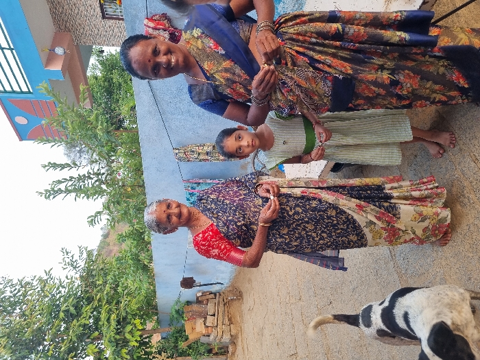 The scene is an outdoor residential area in Koyalaguttapalli, India. Three individuals are positioned facing the viewer. On the left, an elderly woman with gray hair wears a red blouse and a dark floral sari, smiling and holding small, light-colored objects in her right hand. Central to the group, a young girl, barefoot in a striped light green dress, holds similar small, light-colored objects, exhibiting a neutral expression. On the right, a middle-aged woman in a dark floral sari smiles, also holding small, light-colored objects in her right hand. All three individuals display bangles on their wrists. A black and white dog, seen from behind with its tail raised, occupies the lower-left foreground. The background features a light blue wall, a clothesline displaying multiple colorful garments, green trees and bushes, and a residential building with a textured beige lower section and a blue upper facade. The ground surface is light-colored and unpaved.