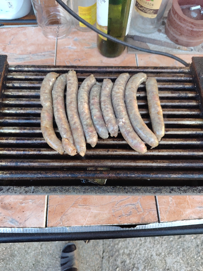 The image displays an outdoor grilling scene in Rozino, Bulgaria. Ten uncooked or lightly par-cooked sausages, light greyish-pink in color with minor surface irregularities, are horizontally arranged on a black metal grill with parallel grates. The grill appears used. In the background, on a surface tiled with light brown squares, a collection of items is visible: a white plastic container, an empty clear glass, a yellow-labeled bottle, a green glass wine bottle, a clear glass bottle labeled "BOURBON," and a brown, textured ashtray containing cigarette butts. A black cable stretches across the upper portion of the scene. Below the grill, the tiled surface continues, transitioning to a grey, textured ground. The tip of a foot wearing a dark sandal is partially visible in the bottom-left foreground.