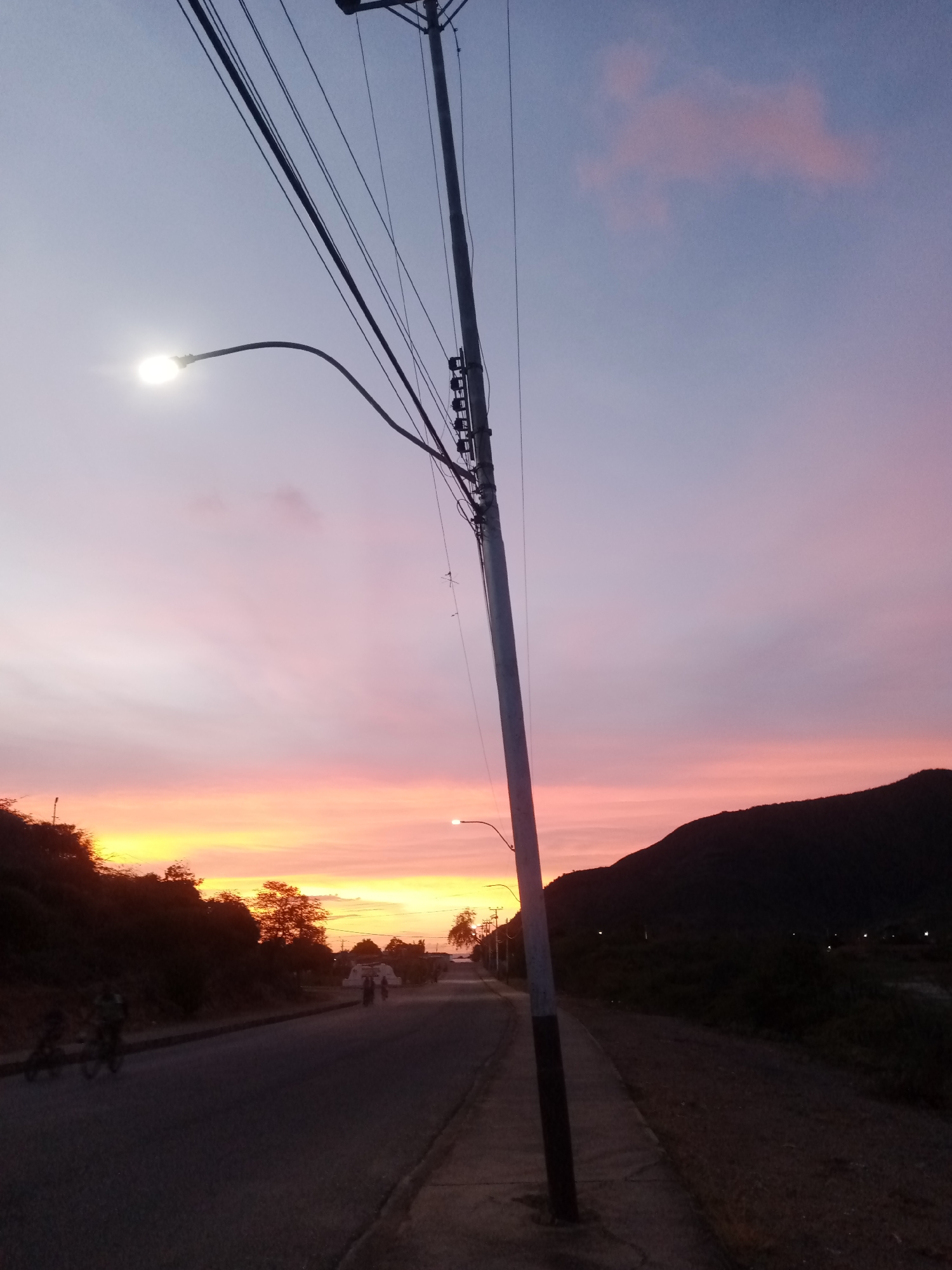 The image depicts a street scene in Juan Griego, Venezuela, at dusk. The sky transitions from yellow-orange near the horizon to pink and light purple overhead. A utility pole stands prominently in the foreground, with attached electrical wires and a curved street lamp illuminated. A street stretches into the distance, bordered by vegetation and a mountain on the right side. Two cyclists are visible on the left side of the street. Additional people are seen further down the street.