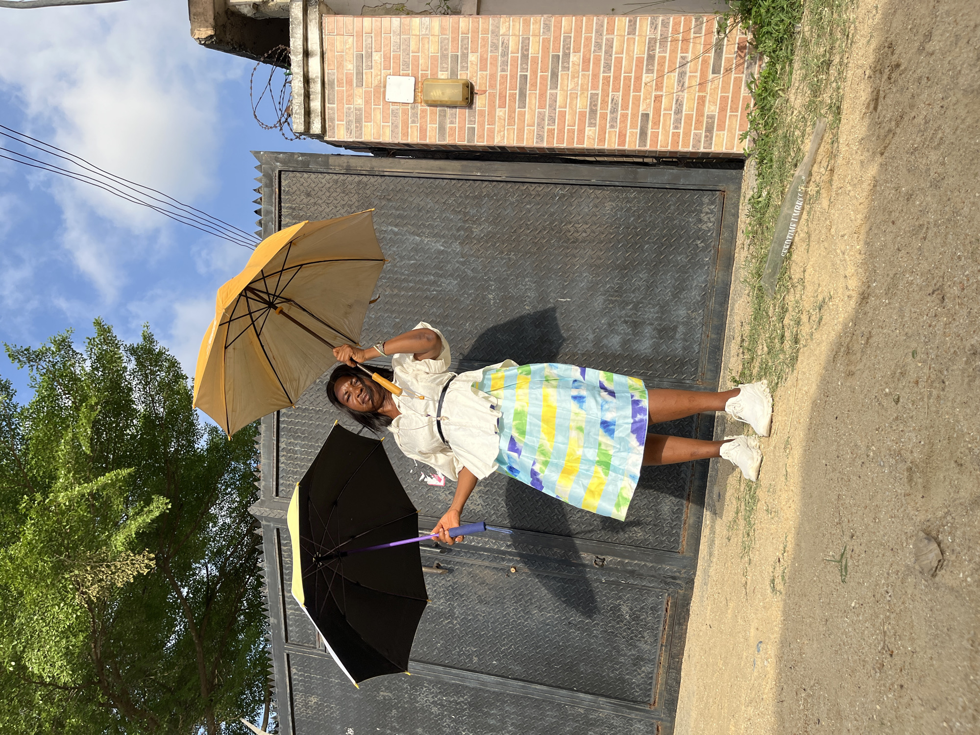 A full-body shot depicts an adult female positioned outdoors in the city of Iranla, Nigeria. She stands on a light-brown sandy or dirt surface with sparse green vegetation, facing slightly left of the camera with a squinted expression. The female has dark skin, long dark hair, and is wearing a light-colored, long-sleeved collared shirt, a black belt, a colorful pleated midi skirt with blue, yellow, green, and purple patterns, and white athletic sneakers. Her left hand holds a closed, black umbrella with a yellow rim and purple handle, pointing downwards. Her right hand holds an open, mustard-yellow umbrella, angled slightly upwards above her head. Behind the subject is a large, dark-colored metal gate featuring a diamond plate pattern. To the right of the gate, a light-brown brick pillar or wall section is visible, topped with coiled barbed wire. A rectangular yellow-toned light fixture is mounted on this brick structure. Overhead, multiple black electrical wires stretch across a bright blue sky with scattered white clouds. A large tree with dense green foliage is present in the upper left background, casting shadows on the ground. A discarded clear plastic object, possibly a wrapper with partial text "SEEDTIME UMBREL", lies on the ground in the lower right. The scene is brightly lit by direct sunlight, casting distinct shadows.