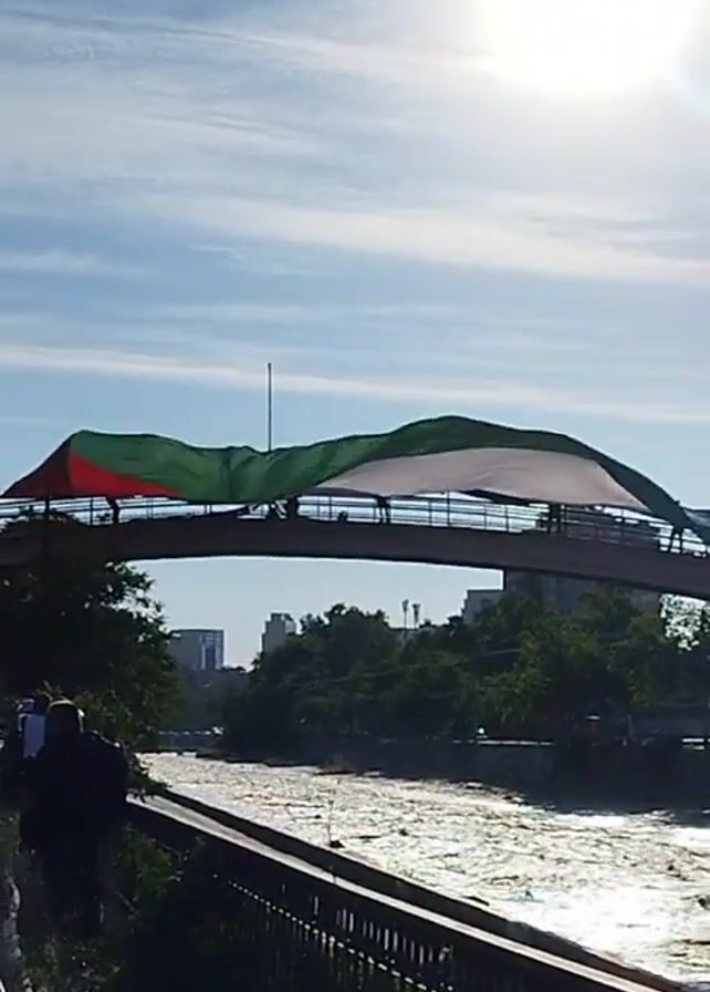 A wide shot shows a pedestrian bridge over a river. People are walking on the bridge, holding a large flag that spans its length. The flag appears to be tri-colored, with bands of red, white, and green. The sun is shining brightly, creating a glare on the water's surface. A black metal railing runs along a path on the side of the river, and a small group of people walk by. Buildings are visible in the background beyond the trees along the opposite bank. The river is flowing quickly.