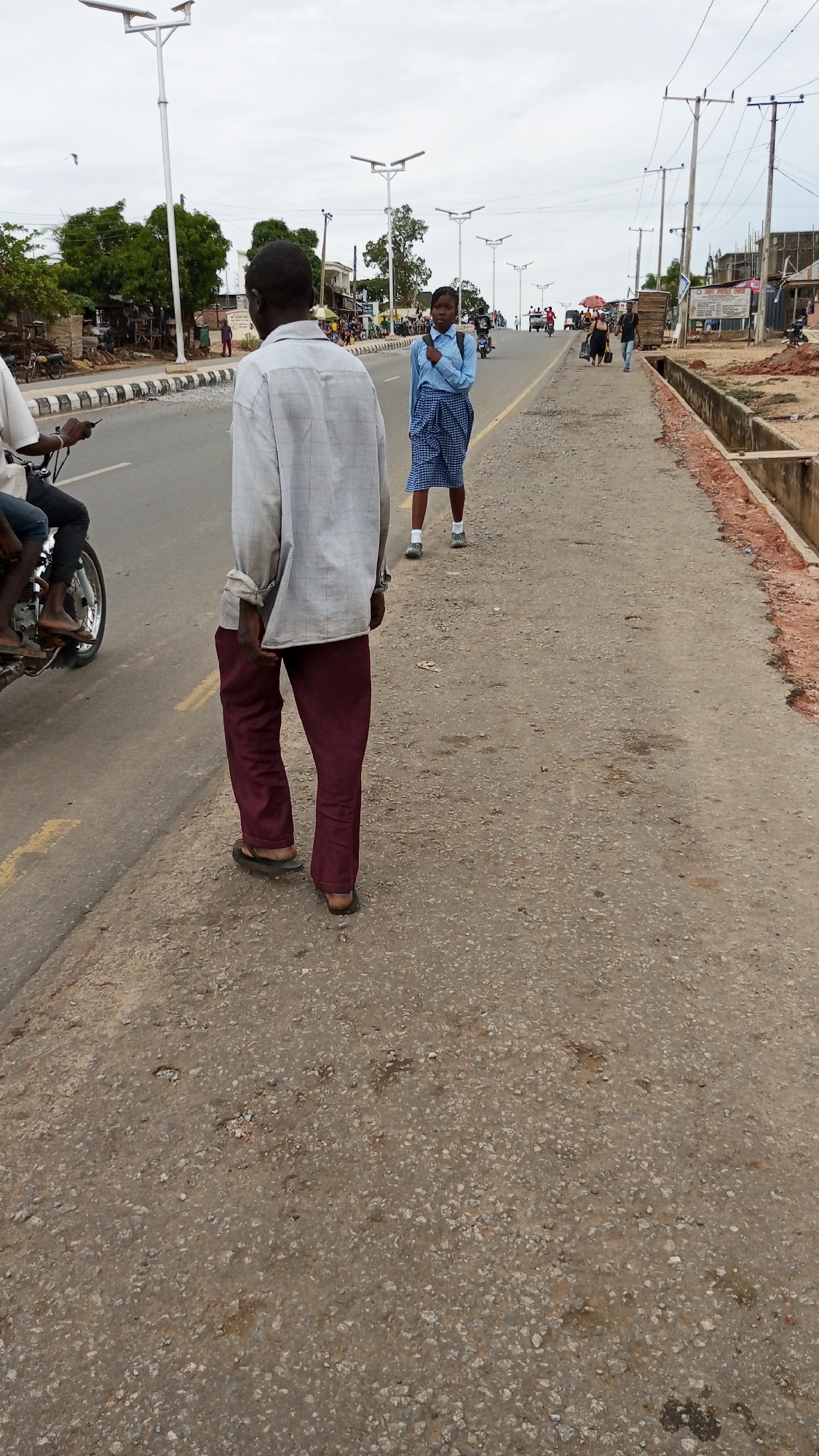 The image depicts a street scene in Zango-ndaji, Nigeria. In the foreground, a man in a light-colored shirt and maroon pants walks away from the camera, wearing sandals. A person on a motorcycle is to his left. Further down the road, a young girl in a blue shirt and patterned skirt stands on the side of the road. The road is lined with sidewalks and gutters. In the background, there are buildings, trees, and several other people on the street. Streetlights line the road. Power lines are visible overhead. The sky is overcast.