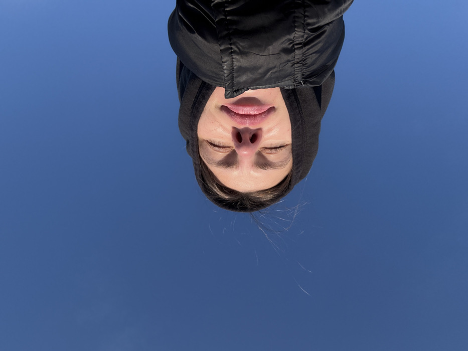The scene, located in Прикамский, Russia, captures a low-angle vertical view of an individual against a clear, cloudless blue sky. The subject is a person, seen from approximately the upper chest upwards, wearing a dark, possibly black, hooded jacket. Their head is tilted significantly backward, with eyes closed and lips slightly parted. Strong sunlight illuminates the face from above, creating highlights on the nose, upper lip, and forehead. No other subjects or objects are visible within the frame. The environment is dominated by the bright, uniform blue of the sky.