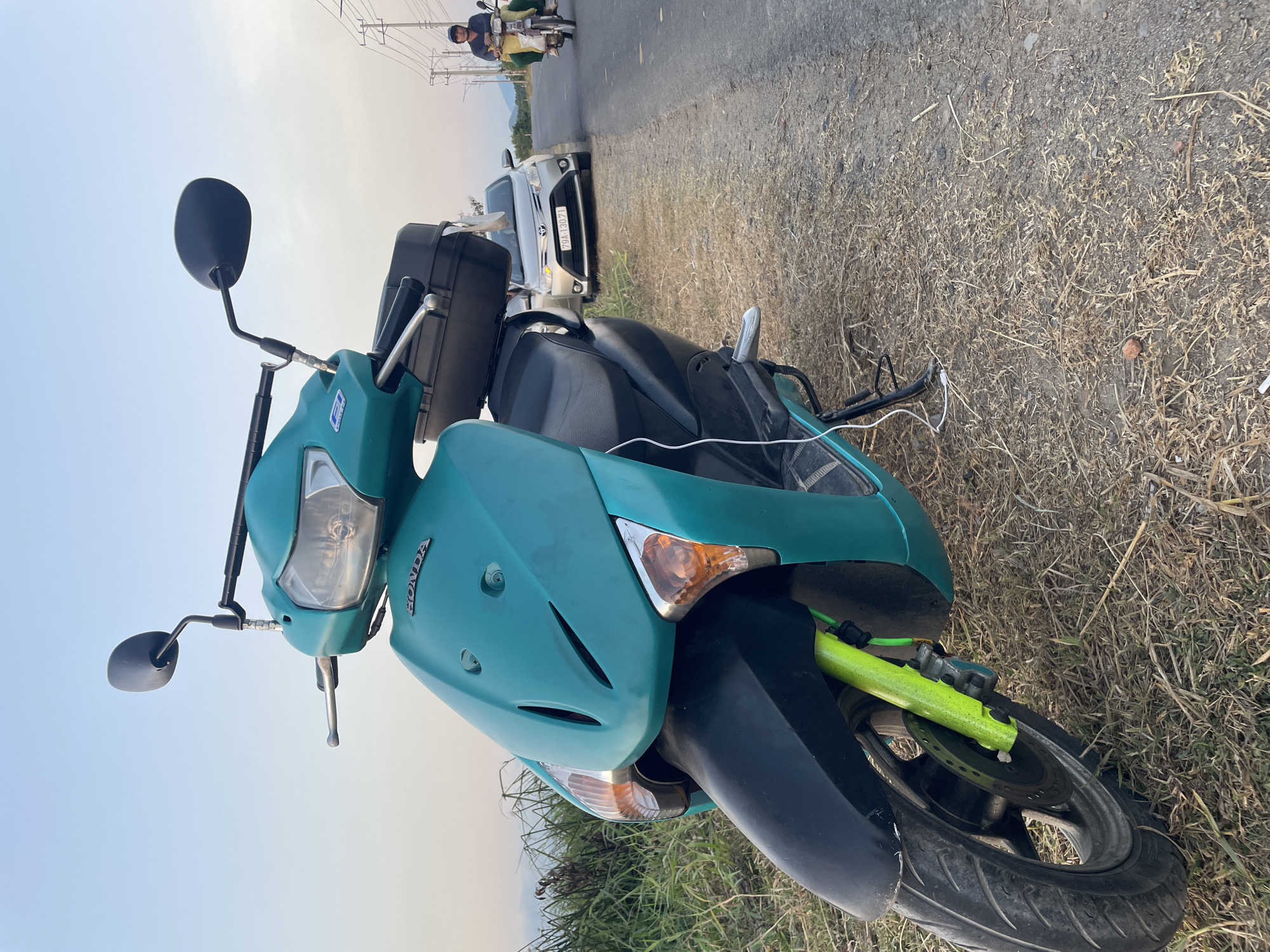 teal Honda scooter parked on the side of a road in Bac Ninh Hoa, Vietnam. The scooter has a black storage box mounted behind the seat. A silver car is parked on the road behind the scooter, with the license plate visible as "79A 130.71." In the distance, a person is riding a motorcycle on the same road. The scooter is partially surrounded by dry grass and sparse vegetation. The sky is pale, suggesting either early morning or late afternoon.