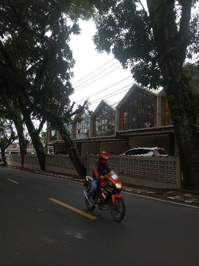 A person rides an orange motorcycle on a road with a yellow line. Modern buildings with peaked roofs and large windows line the street behind a low, patterned fence. Cars are parked in front of the buildings. Large trees flank the road, their branches arching overhead, creating a partial canopy and framing the scene. Power lines are visible against the overcast sky.