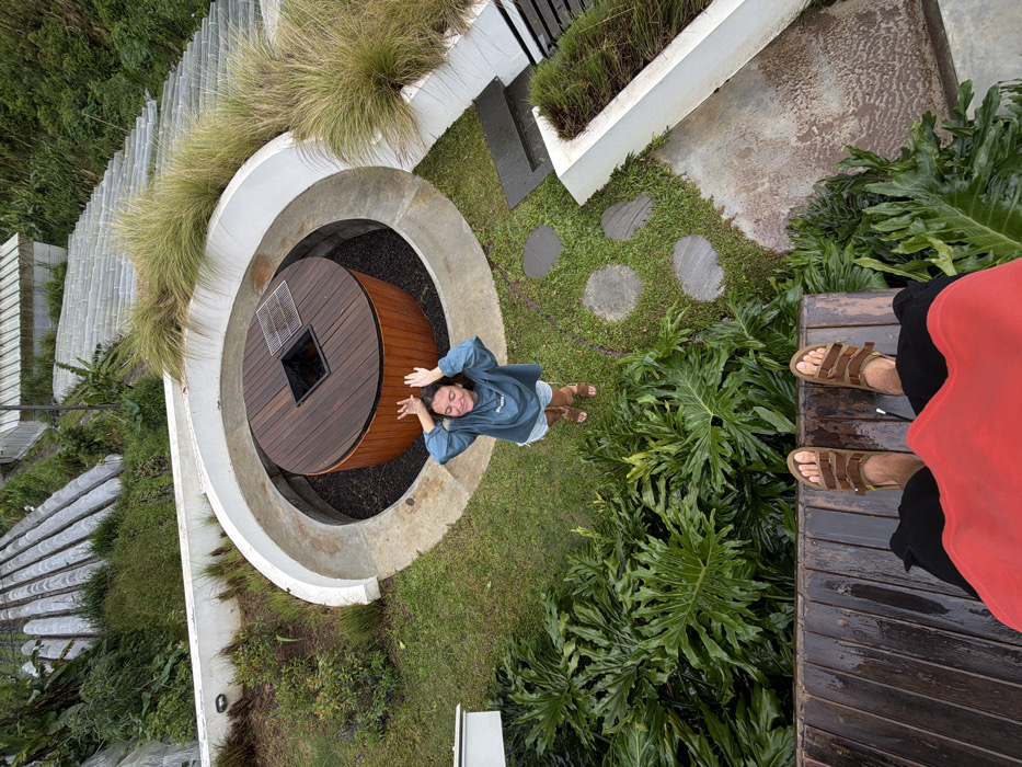 An overhead shot reveals a woman laying on a circular wooden fire pit. She's wearing a blue shirt and shorts, arms outstretched. Around the pit is a concrete circle filled with dark gravel and surrounded by green grass. Lush greenery is scattered around the scene, including large tropical plants. A set of stairs leads up a hill. To the right, a person stands on a wooden deck in brown sandals and a red shirt.