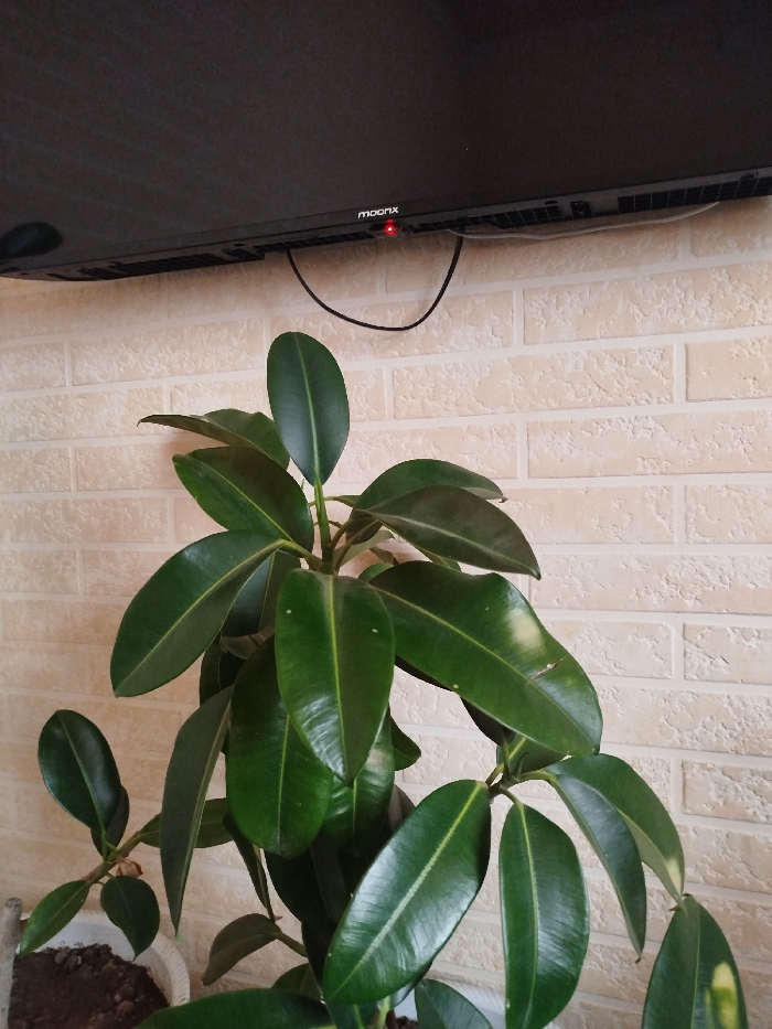 The scene depicts an indoor environment in Mirzabashichek, Uzbekistan. A prominent Ficus elastica houseplant occupies the lower frame, displaying numerous large, dark green, glossy leaves, some with minor white blemishes. The plant is situated in a white pot, partially visible at the bottom left. Behind the plant, a light-beige wall with a simulated brick texture is visible. Mounted high on this wall is a black flat-screen 'moonx' brand television, identified by its logo and an illuminated red standby indicator light. A single black cable hangs vertically from the television's underside. No individuals are present.