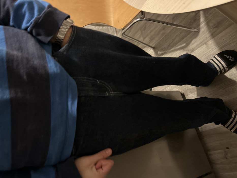 An overhead shot shows a person seated, wearing blue jeans and black and blue striped shirt. A silver watch is visible on their left wrist. They are wearing black and white striped slides. The person sits at a wooden chair. The floor is wood or wood laminate. The person's hand is visible near the bottom left of the frame.
