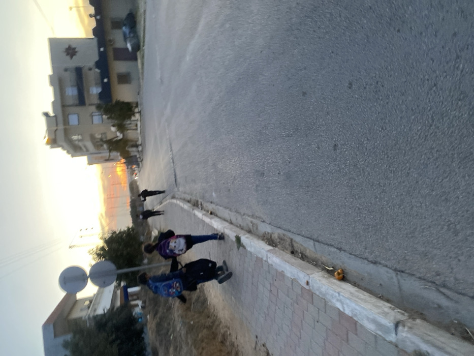 A sideways view showcases a street with people walking on the sidewalk. Most appear to be children wearing backpacks, heading towards the sunset visible in the distance. The street stretches towards the horizon, bordered by buildings and trees. In the foreground, a few warning signs are seen. The overall scene is one of daily life in a residential area. An orange or tangerine sits in the gutter between the sidewalk and road.