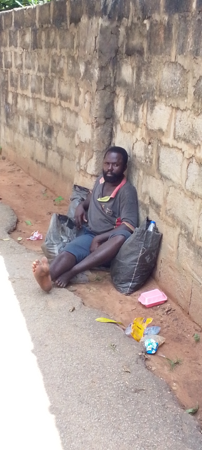 An adult male subject is seated on reddish-brown earth, leaning against a weathered stone wall at a street side in Onitsha, Nigeria
