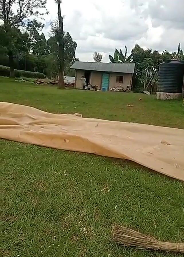 The scene is an outdoor grassy area with a large tan cloth laid out on the grass in the foreground. A broom lies near the bottom right corner of the frame. In the background, a small, simple house with a light blue door is visible. A person is seen standing near the doorway of the house. To the right of the house, there is a large black water tank. Trees and greenery surround the area, and the sky is cloudy.
