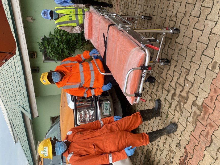 Three men in personal protective equipment stand around a hospital gurney. One wears an orange jumpsuit, yellow hardhat, blue gloves, and black boots. The second has on an orange jacket, blue gloves, and a yellow hat. The third man sports a blue cap and yellow vest. The vehicle behind the first man is orange, with "NEMA" on it. The background is a green building. They are standing on a brick-paved area.